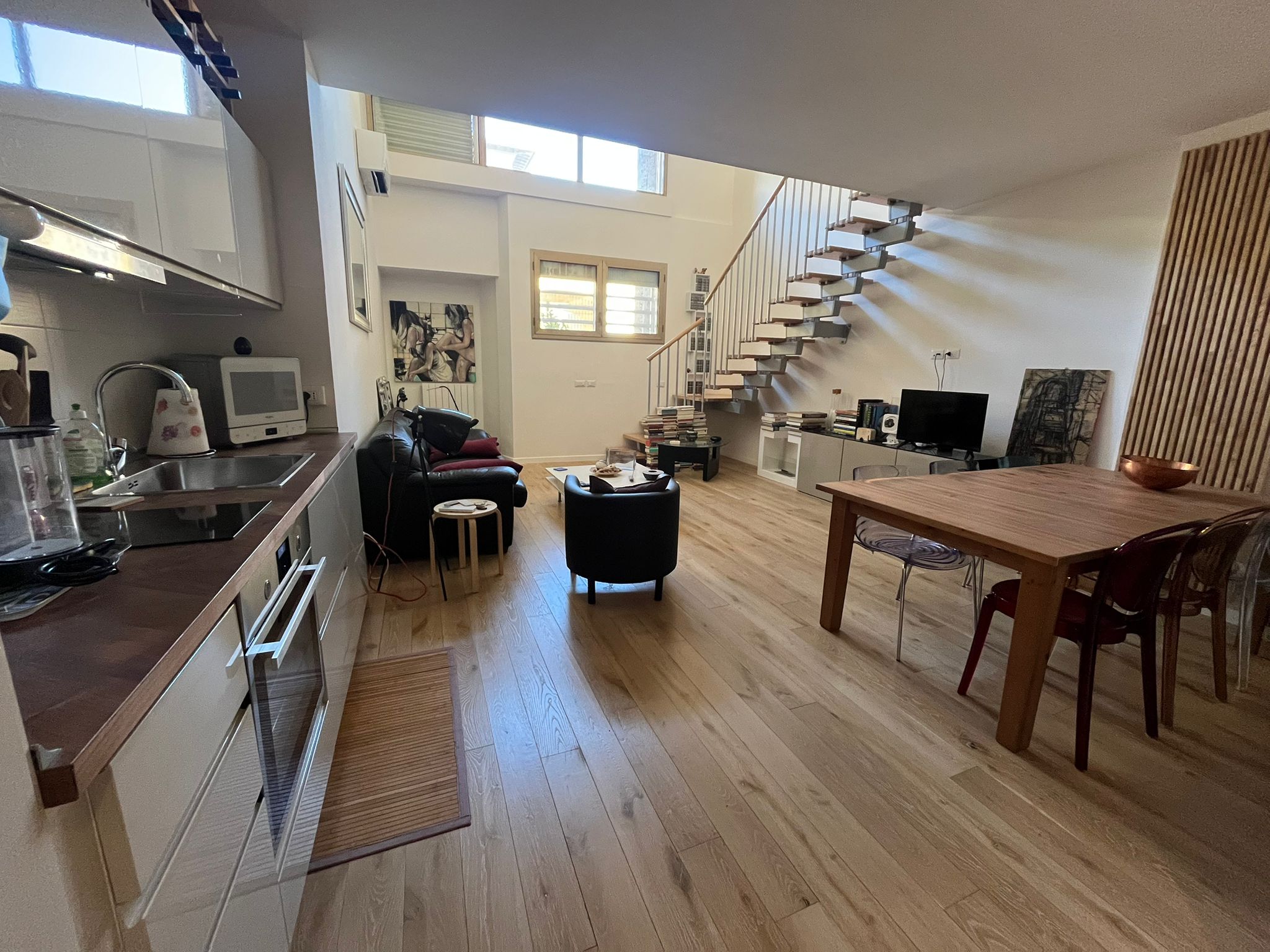 L’ingresso introduce a una piacevole zona giorno, accogliente e ben organizzata, con angolo cottura a vista perfettamente integrato nello spazio. La zona notte, posta in un suggestivo soppalco, garantisce privacy e un tocco di originalità all’ambiente. Completano la proprietà un bagno moderno con doccia e un pratico ripostiglio adibito a lavanderia, funzionale e ben studiato.